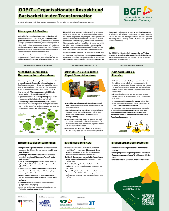 Basisarbeitende sind oft unzureichend in die betriebliche Arbeitsschutzorganisation eingebunden, haben seltener Zugang zu Angeboten der betrieblichen Gesundheitsförderung und arbeiten unter beanspruchenden Bedingungen. Sie verfügen über geringe Handlungsspielräume und haben seltener Zugang zu Weiterbildungsangeboten. Mit ORBiT wollen wir die Lebens- und Arbeitswirklichkeit der Zielgruppe sichtbar machen und ihre Sichtweise auf die betriebliche Wirklichkeit in den Fokus rücken. Das Projekt stellt die Förderung der Anerkennung, Arbeitsbedingungen und Arbeitszufriedenheit von Basisarbeitenden in den Mittelpunkt und identifiziert Kriterien für einen respektvollen und gesunden Umgang im Unternehmen.